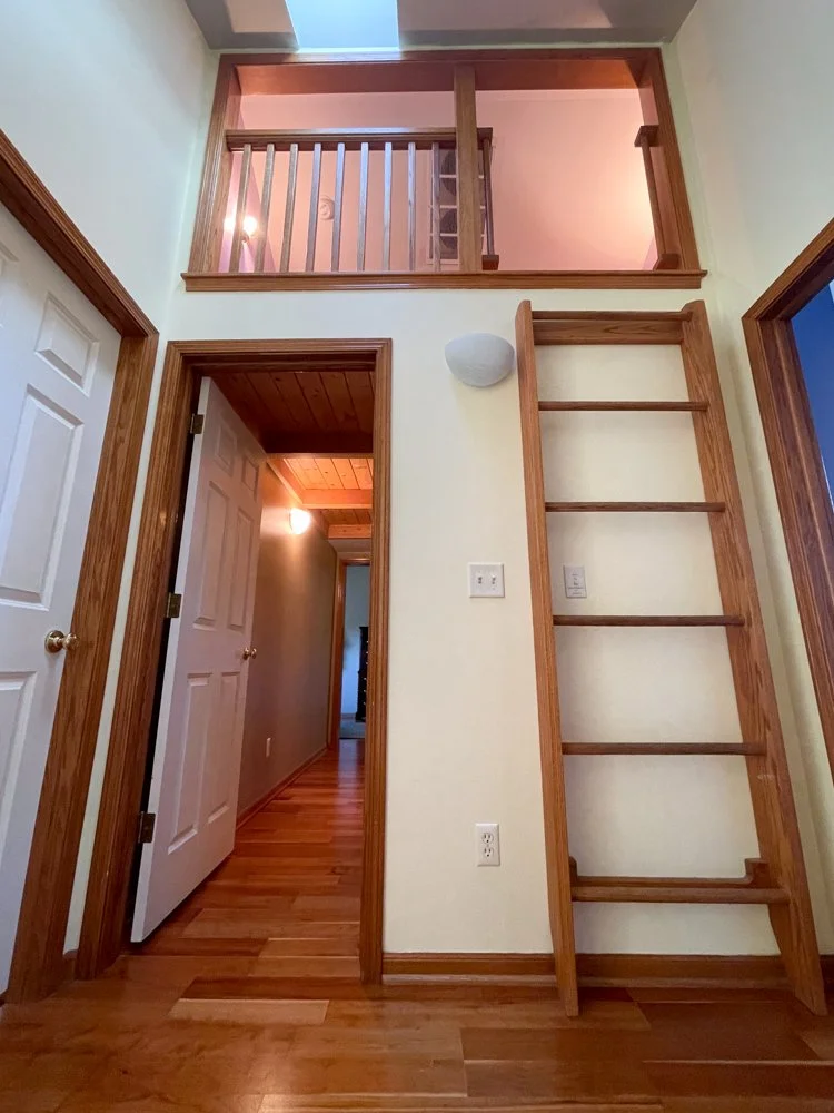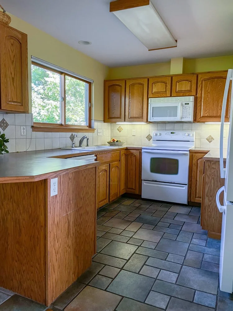Oak cabinets, windows, floors, and stairs